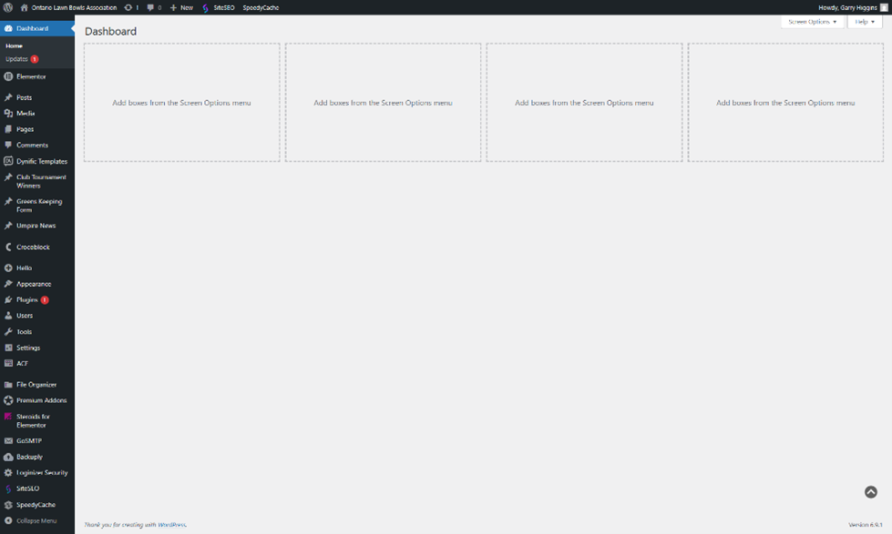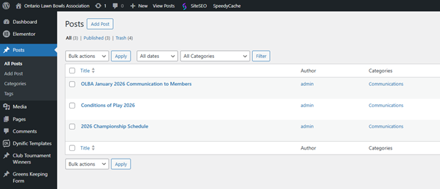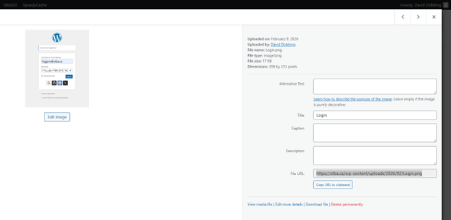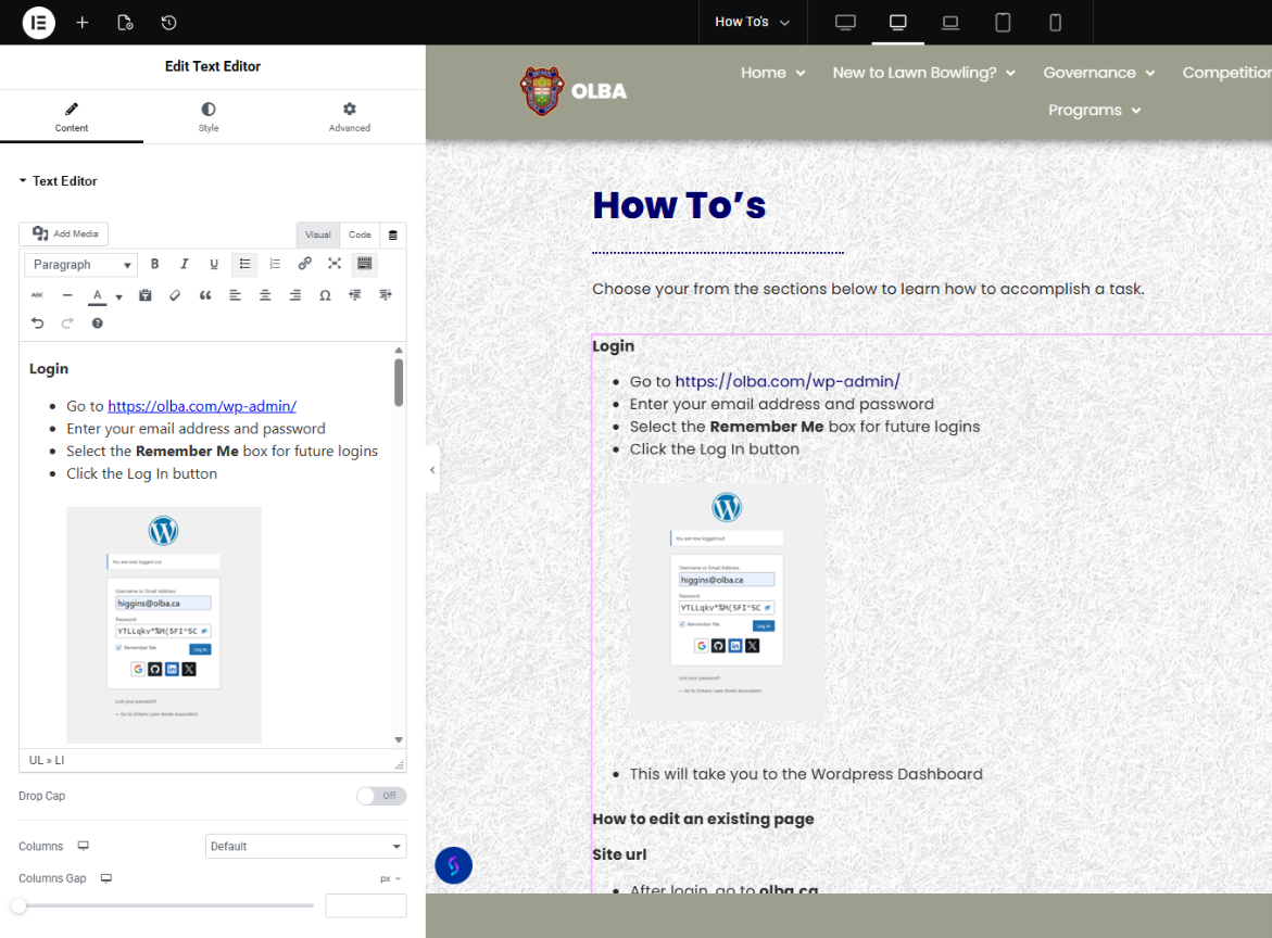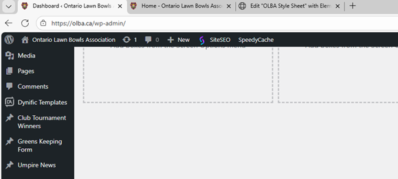 I find it easiest to work with multiple tabs in your browser (hence the right-click). The Dashboard page, The live page – olba.ca (from the Dashboard, hover over the House icon at the top left, right-click the Visit Site link), and the page you are editing.